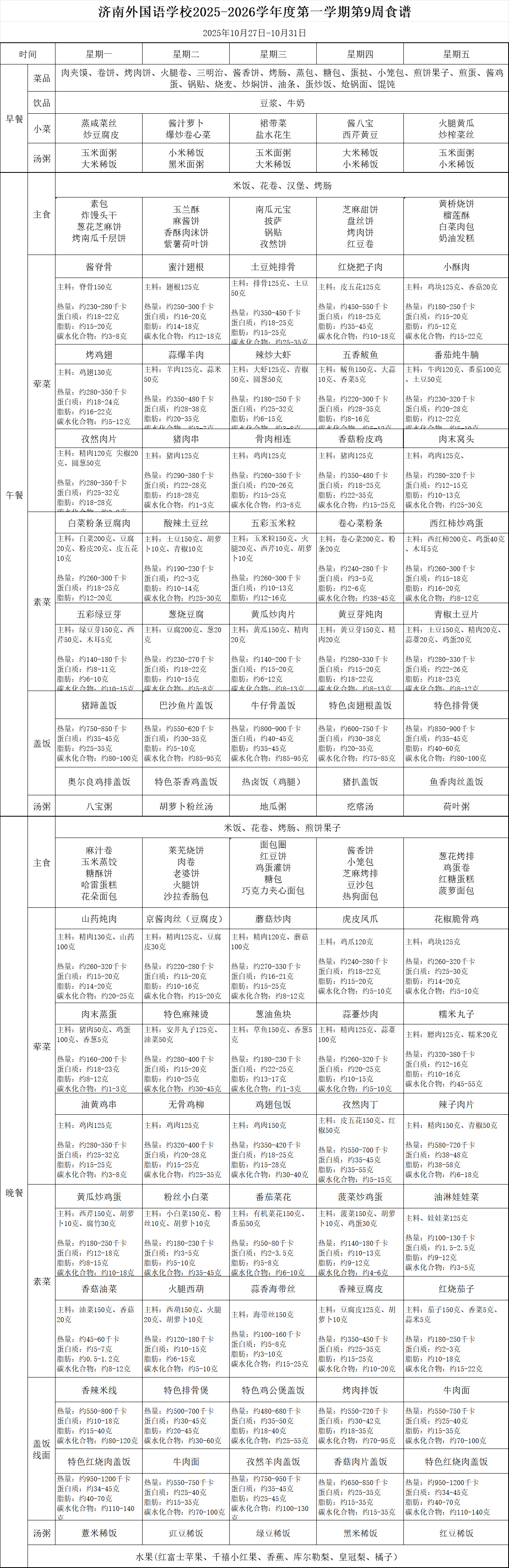 2025-2026学年度第一学期学生餐厅第九周食谱