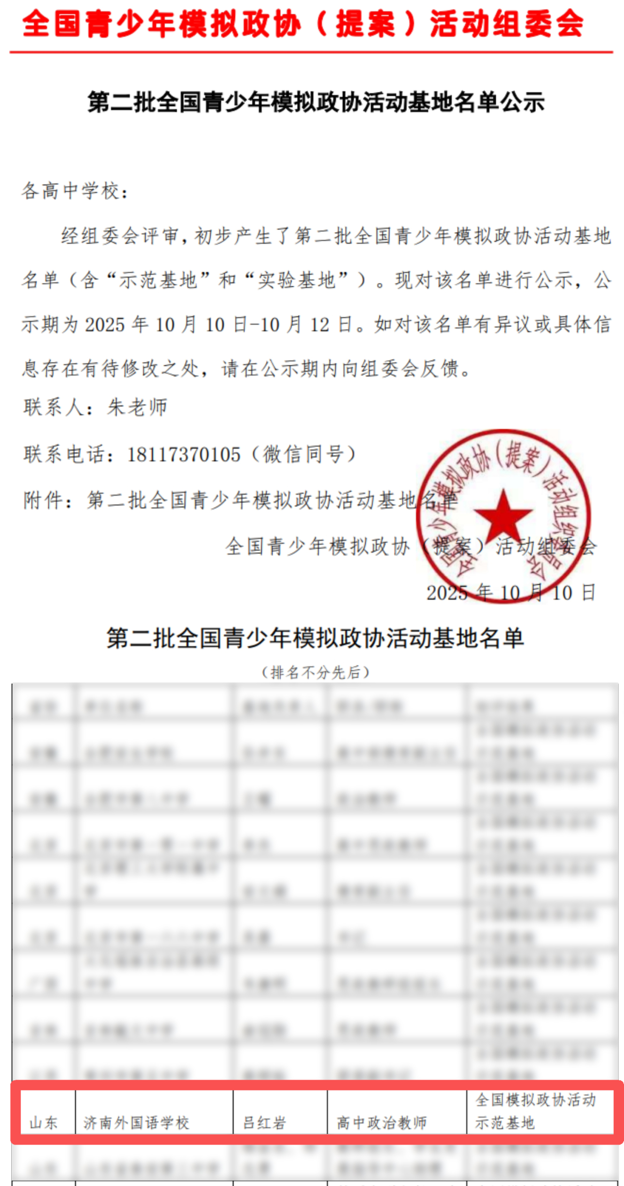 金秋十月,捷报翩至。在2025年全国青少年模拟政协(提案)活动组委会公布的第二批“全国青少年模拟政协活动示范基地”名单中,济南外国语学校凭借七载深耕不辍的扎实实践与丰硕成果,成功入选,为学校思政育人画卷添上了浓墨重彩的一笔。