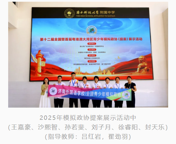 自2017年模拟政协社团组建之初,济南外国语学校便锚定“立德树人”根本方向,围绕社会热点与民生关切,带领学子走出课堂、走进社会。从历史文化保护到民生服务优化,从交通治理升级到特殊群体关怀,济外学子的足迹遍布泉城街巷、田间地头,留下了一串扎实而温暖的实践印记。 七年来,学校连续组织学生参加全国青少年模拟政协展示活动,累计获“最佳提案”“最佳调研报告”“最佳社团”“优秀展示团队”“最佳表演团队”等国家级奖项数十项,每一份荣誉都镌刻着学子的思考与担当。 其中,2024 年学生团队撰写的《关于加强特殊教育教师队伍建设的提案》,经全国政协委员提交至全国两会,被全国政协立案并进入教育部承办程序,让青春声音真正成为推动社会进步的微光。 专业赋能,政治组构建系统化育人生态 济外模拟政协实践的持续深耕与硕果累累,离不开政治组教师团队的专业引领与匠心培育。在教研组长刘振晓的统筹规划下,团队匠心构建“理论奠基—实践锻炼—展示提升”三位一体的课程体系。一方面将模拟政协核心要素无缝嵌入《中国特色社会主义》《政治与法治》等思政必修课程,让民主协商理念浸润日常教学,保障全员接触政治实践、涵养公民意识;另一方面独立开设“模拟政协理论与实践”校本选修课,形成“嵌入式+选修课”双轨并行模式,为学子搭建个性化成长阶梯。 团队更积极联动外部专业资源,邀请政协委员和行业专家担任校外导师,指导学生打磨提案、模拟议政。同时,团队聚焦课程实施、评价机制、活动优化等关键议题,常态化开展模拟政协专题教研会。多名教师先后获评“全国最佳指导教师”称号,以专业之力为模拟政协实践护航。 思政融合,“行走的课堂”激活育人实效 济外的模拟政协实践,从未局限于单一活动的开展,而是深度融入学校“行走的思政课”品牌体系,与“社会大课堂”实践课程同频共振。学子在踏访历史建筑时,于一砖一瓦中体悟文化传承的时代使命;在走访特教机构时,于共情交流中深化对社会弱势群体的关怀与担当;在市政协“商量”座谈会上,于真诚沟通中让青春思考在民主协商的平台上落地生根。 2021年,学校组织高三学子走进基层派出所与街道服务大厅,近距离感受政府执法的温度与服务的初心; 2022年,组织学子走进济南市中级人民法院、铁路运输中级人民法院,通过角色扮演沉浸式体验司法流程,涵养法治精神; 2023年,带领高一学子赴中共山东早期革命纪念馆,以革命文物为载体开展情境教学,厚植红色基因。 这种“理论教学+社会实践+政治参与”的深度融合,让思政教育跳出课本、扎根生活、联通社会,引导学子在知行合一中成长为有理想、敢担当、能吃苦、肯奉献的时代新人。 展望未来,青春声音助力国家发展 在与人民政协相伴的日子里,济外学子探索青春声音融入社会发展的无限可能,与无数怀揣爱心与情怀的人共同为时代发展添砖加瓦。同学们深刻体会到,青少年的声音,只要关乎民生、切中要害,就能被听见、被重视,就能为有需要的人出一份力。 如今,中国在世界舞台上愈发从容地发出声音,当代青年该如何让世界进一步读懂中国?济外给出了自己的答案:济外的学子们,在外语特色课程中塑造语言优势,在模拟政协实践中培养家国情怀,在多元活动中涵养“阳光、自信、大气、松弛”四维品格,努力在国际舞台上,把人民政协的生动故事讲给更多外国友人,让世界读懂中国政治制度的显著优势,让青春之声成为传递中国力量的动人音符。 七载躬耕,从初露锋芒到全国示范;青春提案,从校园发声到国家议政。学校政治组将持续深耕思政育人创新路径,让“行走的思政课”走深走实。当更多的济外青春声音飞入议事堂、落进百姓家,无数微光定能聚成火炬,照亮更多人前行的路,照亮中国式现代化的生动征程。