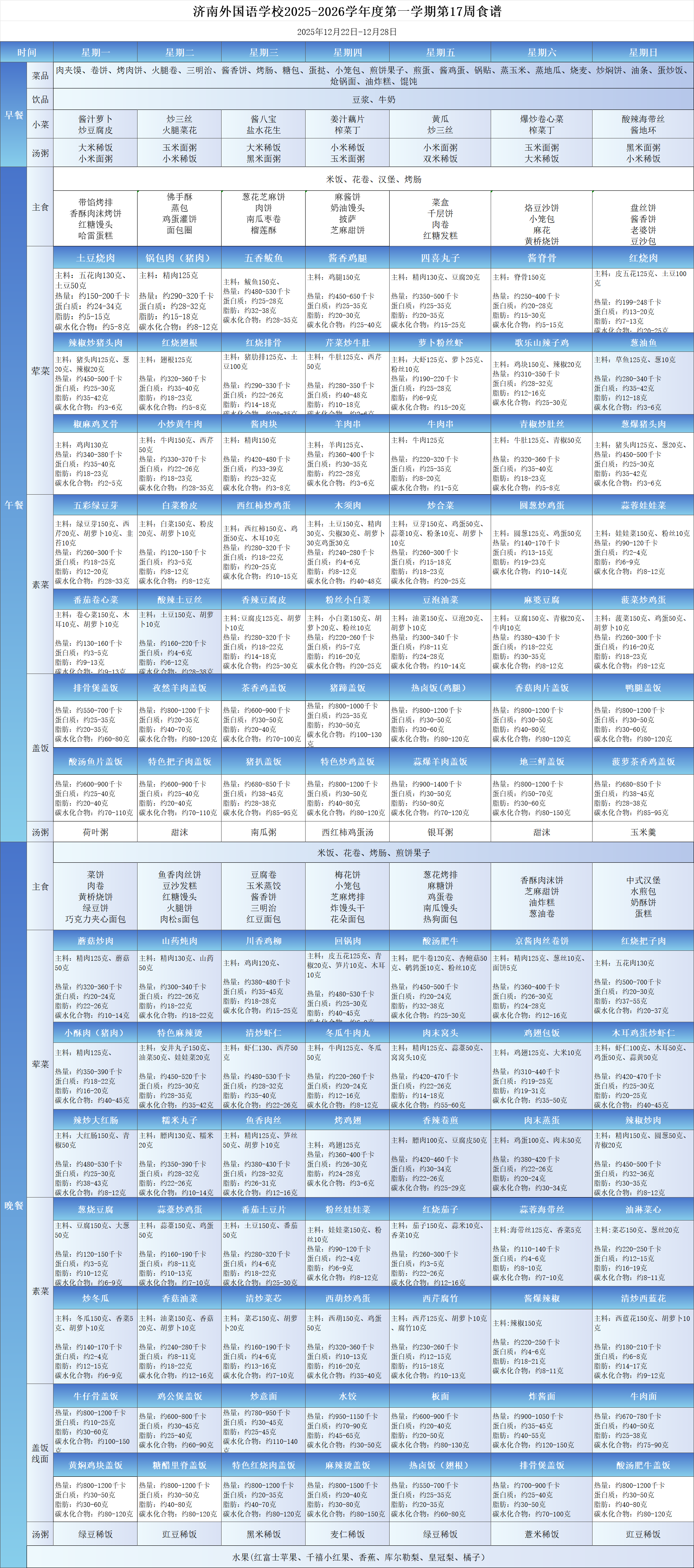 2025-2026学年度第一学期学生餐厅第十七周食谱