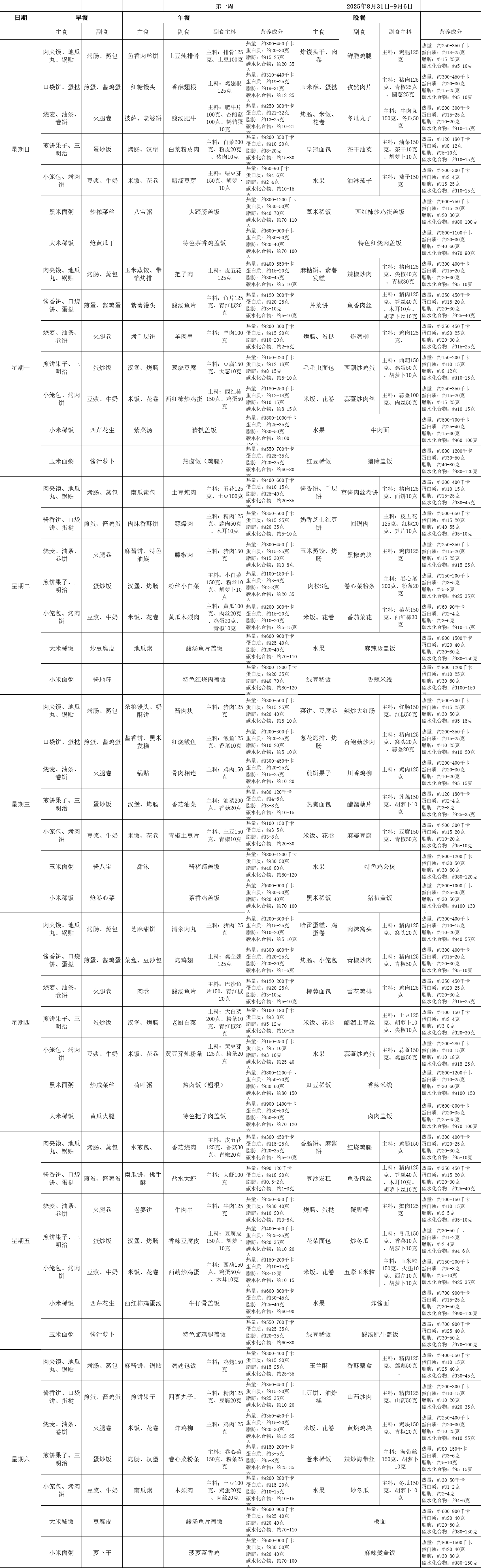 2025—2026学年第一学期学生餐厅第一周食谱