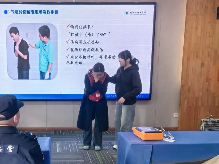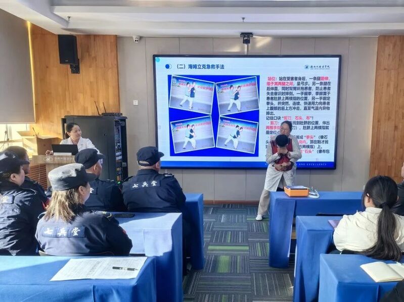 培训伊始,校医郭喜梅围绕“如何正确拨打120”“海姆立克急救法”“心肺复苏与AED使用”等内容展开细致讲解。通过真实案例与视频演示,生动诠释了“第一响应人”的关键作用——在专业医护人员抵达前,及时、规范地出手相助,往往决定着生命的转机。