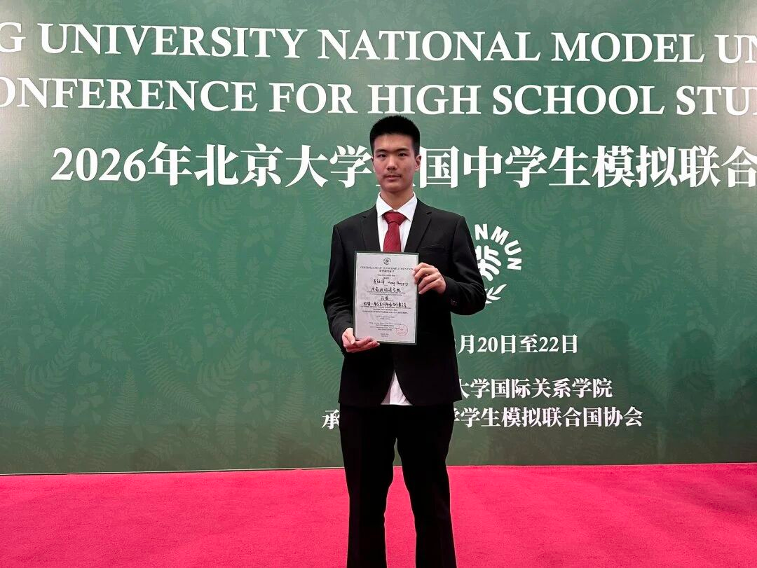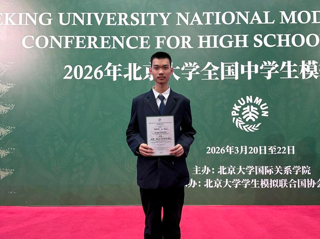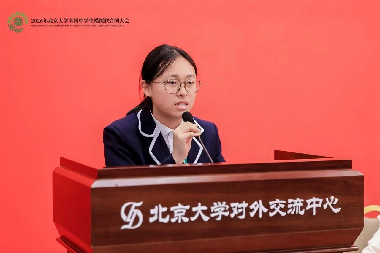 2026年3月20日,北京大学全国中学生模拟联合国大会在北京大学举行。来自全国94所优秀高中的300余名中学生齐聚燕园,共赴这场青年学术盛会,我校由徐路老师带队,派出苏天依、葛千路、黄钲洋、刘国浚四名学生代表参会,他们凭借出色表现赢得多项荣誉。