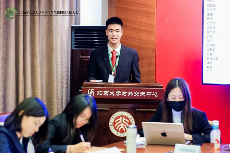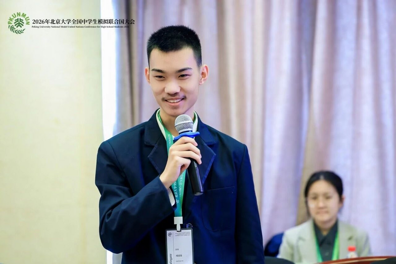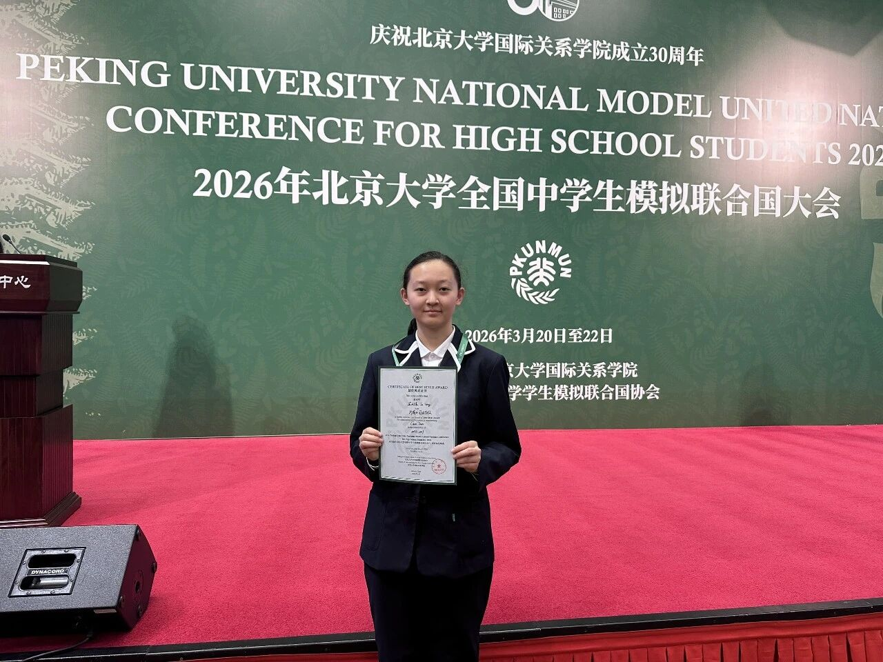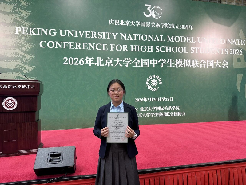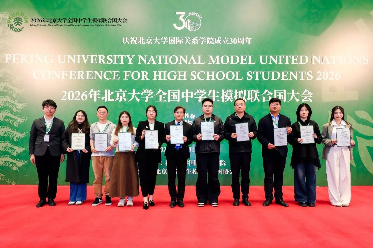 2026年3月20日,北京大学全国中学生模拟联合国大会在北京大学举行。来自全国94所优秀高中的300余名中学生齐聚燕园,共赴这场青年学术盛会,我校由徐路老师带队,派出苏天依、葛千路、黄钲洋、刘国浚四名学生代表参会,他们凭借出色表现赢得多项荣誉。
