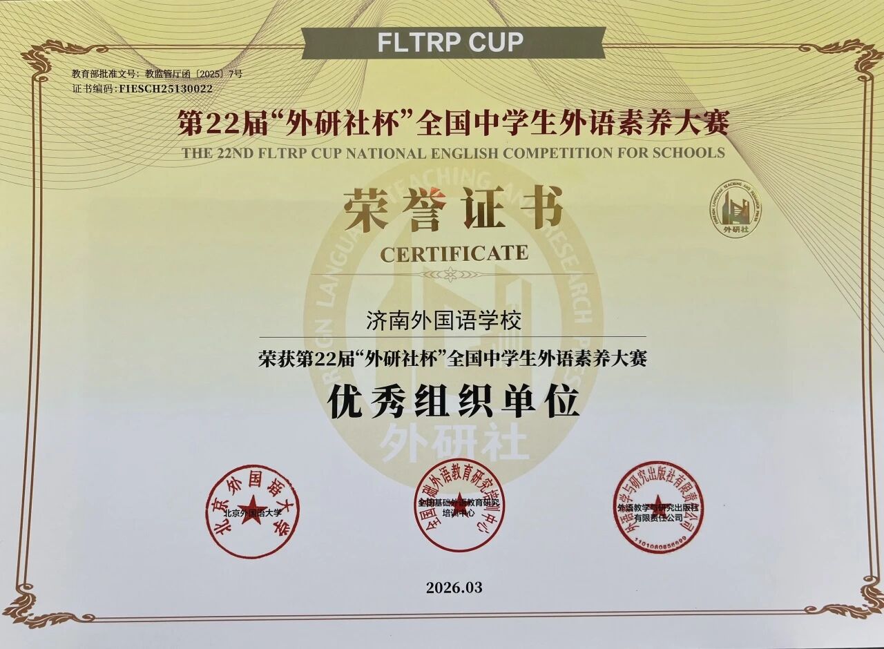 此次“外研社杯”的丰硕成果,再次彰显了济南外国语学校学子的风采与实力。学校将以此为契机,持续推动外语教学与跨文化交流迈上新台阶,不断完善课程体系与实践平台,激励全体师生奋勇争先,共同书写学校高质量发展的新篇章。
