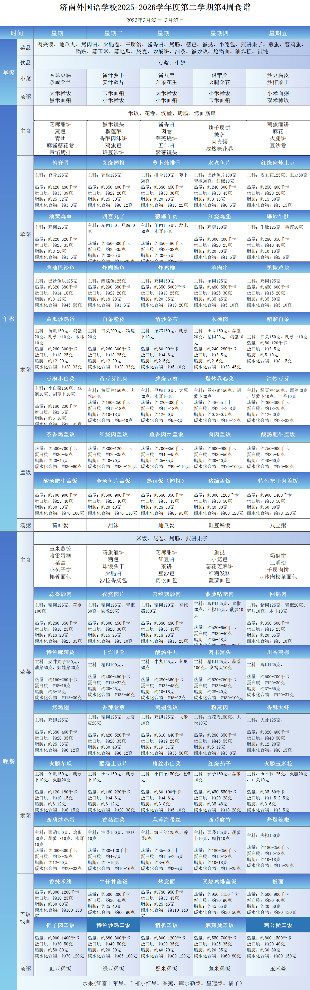 济南外国语学校2025-2026学年度第二学期第4周食谱