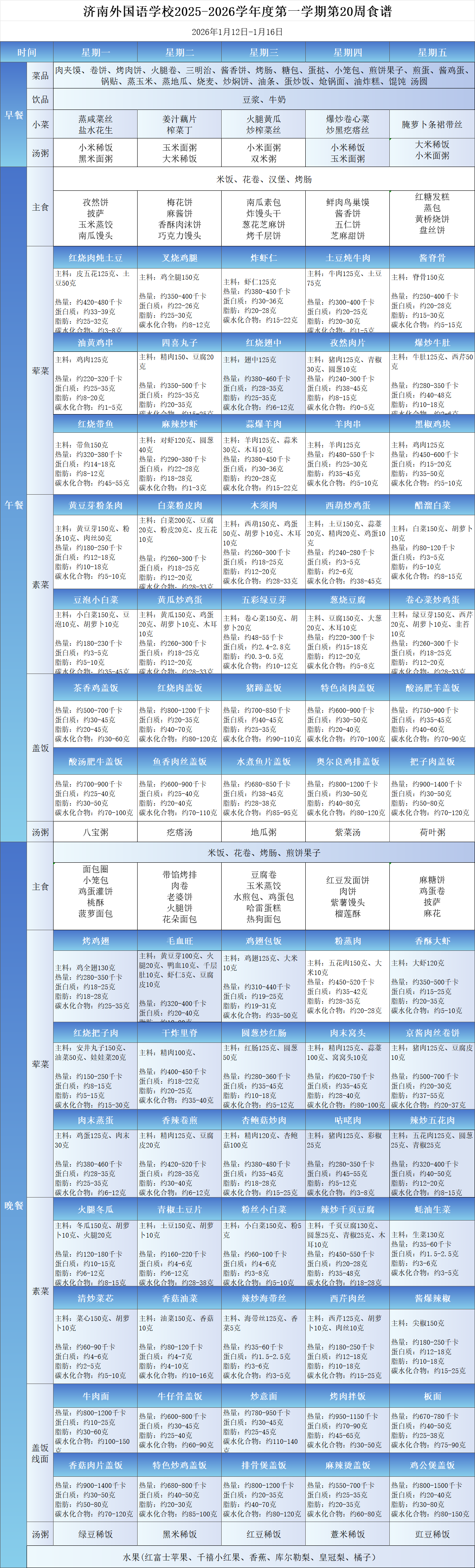 2025-2026学年度第一学期学生餐厅第二十周食谱