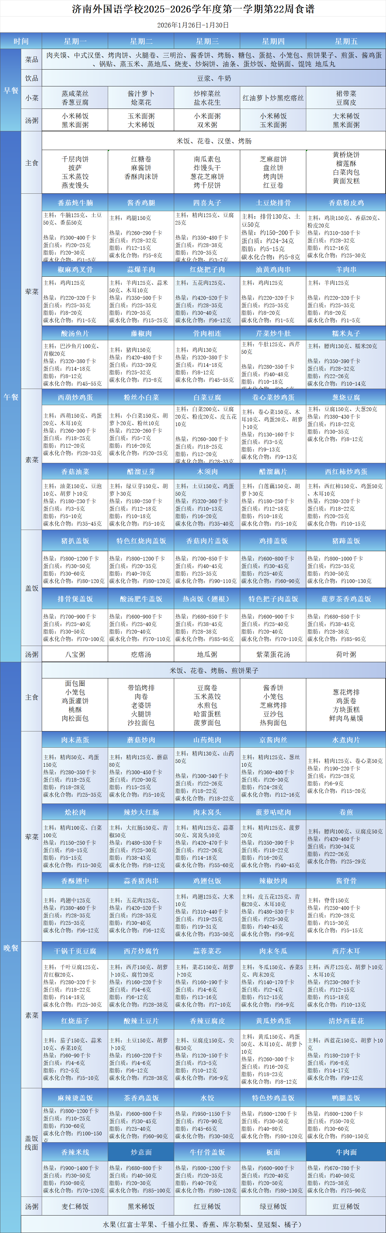 2025-2026学年度第一学期学生餐厅第二十二周食谱